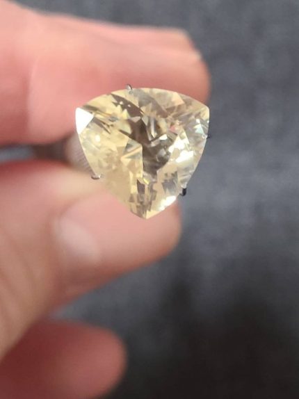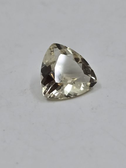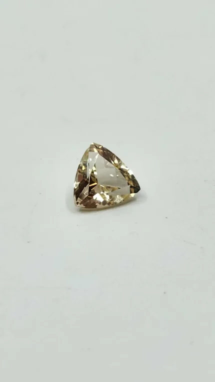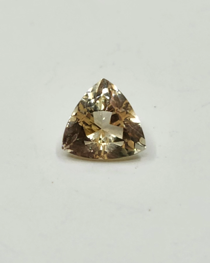 People sometimes scoff at the idea of a champagne colored Oregon Sunstone. They're much more common than the pinks, reds, or greens, but sometimes they can be just as beautiful. The fact that they're more common also means a very affordable price. This 1.9ct Oregon Sunstone trillion is champagne in color with a little bit of copper schiller to add some extra sparkle. In the sun, you'll see shades of pink and green in it as well as that golden champagne color. The size is perfect for a ring or a pendant at 8.3mm.