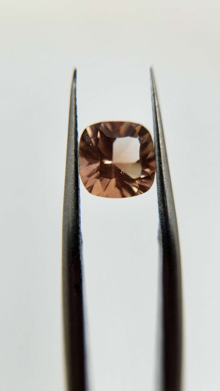 Here's a nice little Oregon Sunstone with some fantastic color and copper schiller. Oregon Sunstone is such a fun material because no two stones are ever 100% alike. This one has that AAA copper schiller, and the color is a nice dark pink, a little less orange than some. The color is almost what I'd call a Padparadscha pink. There are many legends around Oregon Sunstone and Sunstone in general. The Northern Piute legend is that a great warrior fell wounded by an enemies arrow. The warriors blood carried his spirit into the stones, staining them red and giving them sacred power. The Norse were known to have used calcite to be able to determine the location of the sun on overcast days, but this is different from the silicate feldspar we know as Sunstone today. While there are other feldspar materials known as Sunstone, Oregon Sunstone is the only one with the unique copper inclusions. This particular gem weighs 1.02ct and measures 6mm. It's cut into a cute cushion design that would work well in a ring or a small pendant.