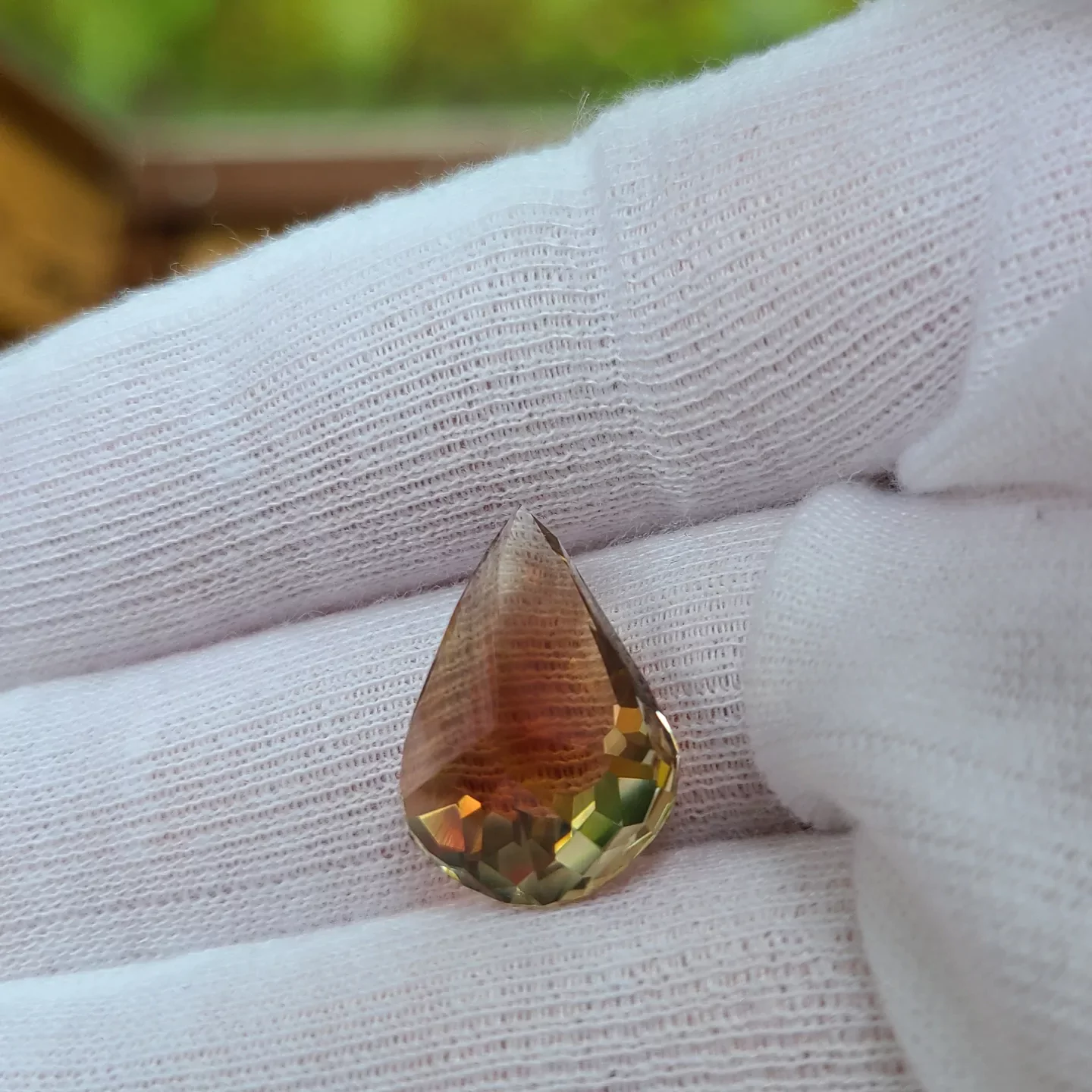 Massive 16.5ct Barion Pear Cut Oregon Sunstone from Dust Devil Mine. Golden orange/peach with green edges and copper schiller. 100% natural, mined and cut in the USA. 22.2×14.7×10.7mm — perfect for a show-stopping pendant.