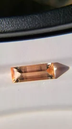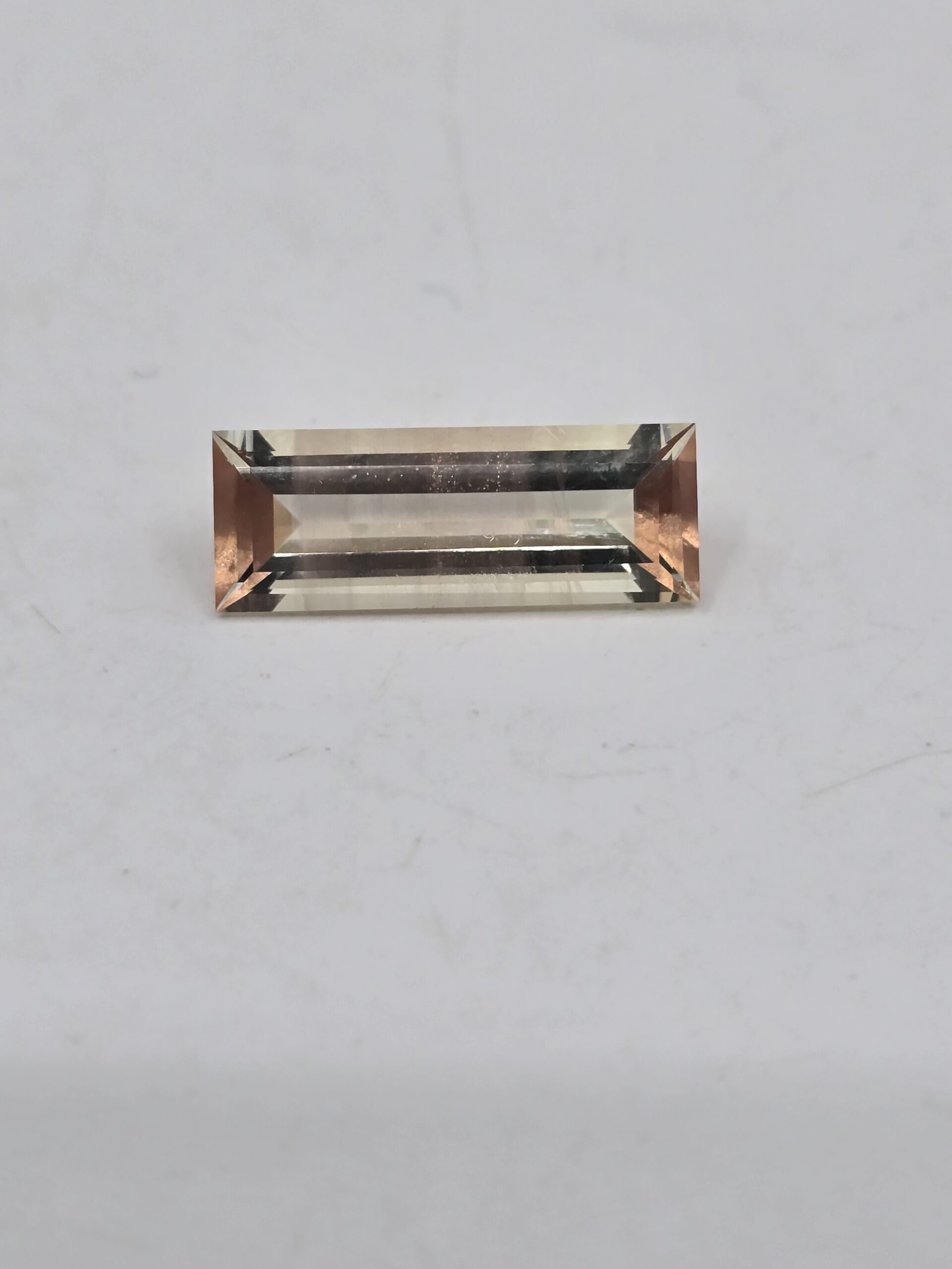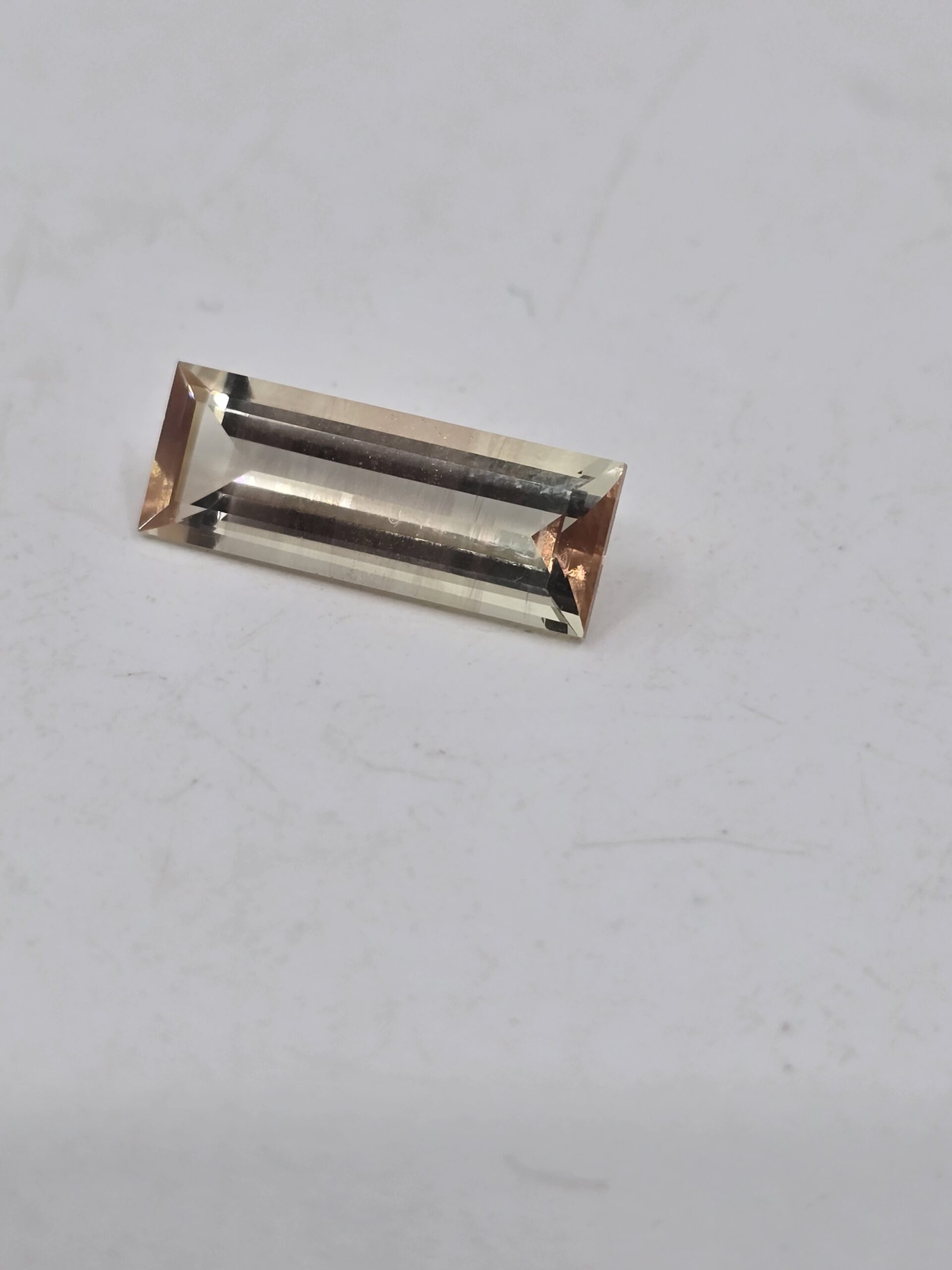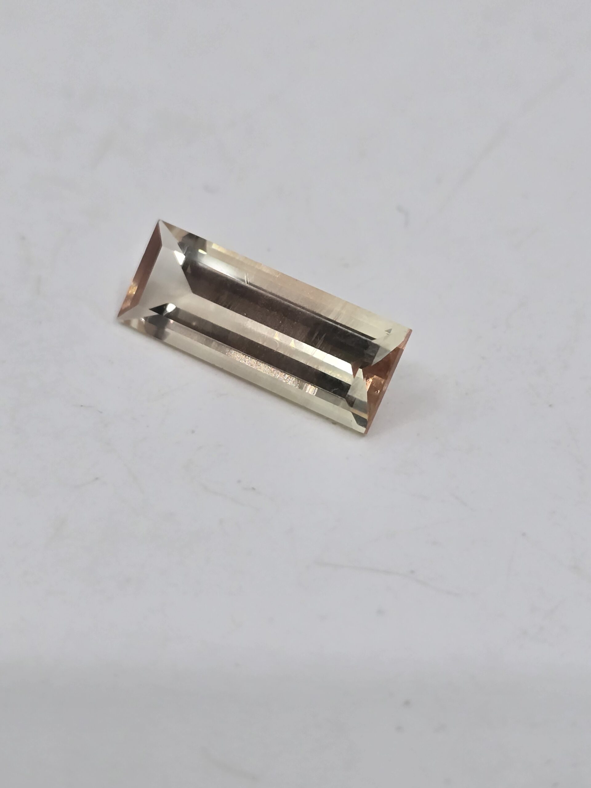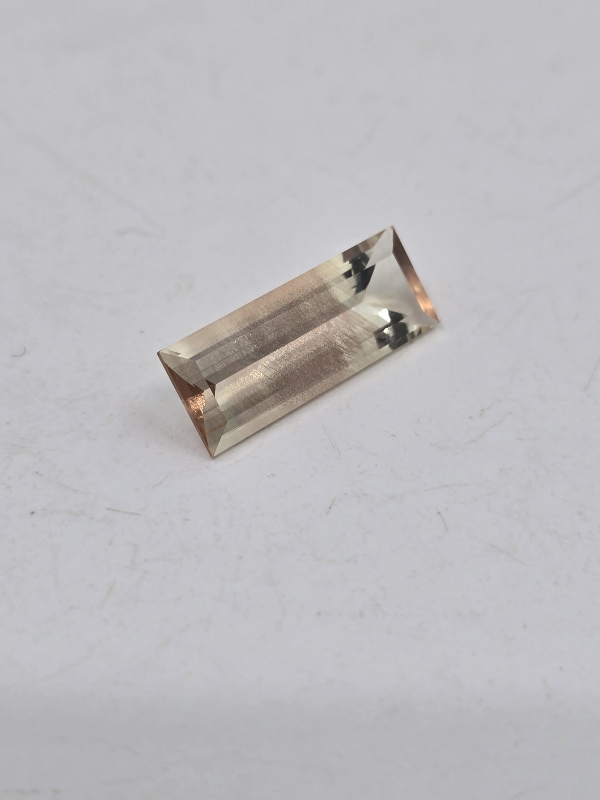 This striking 5.11 carat Oregon Sunstone is a showpiece gemstone, beautifully cut in an elongated baguette shape measuring 18.8 x 7mm. The standout feature of this stone is its rich, reflective copper schiller, which creates an almost banded appearance as light dances across its surface. Subtle flashes of blue at the edges add even more depth and intrigue, making it a visual delight from every angle.