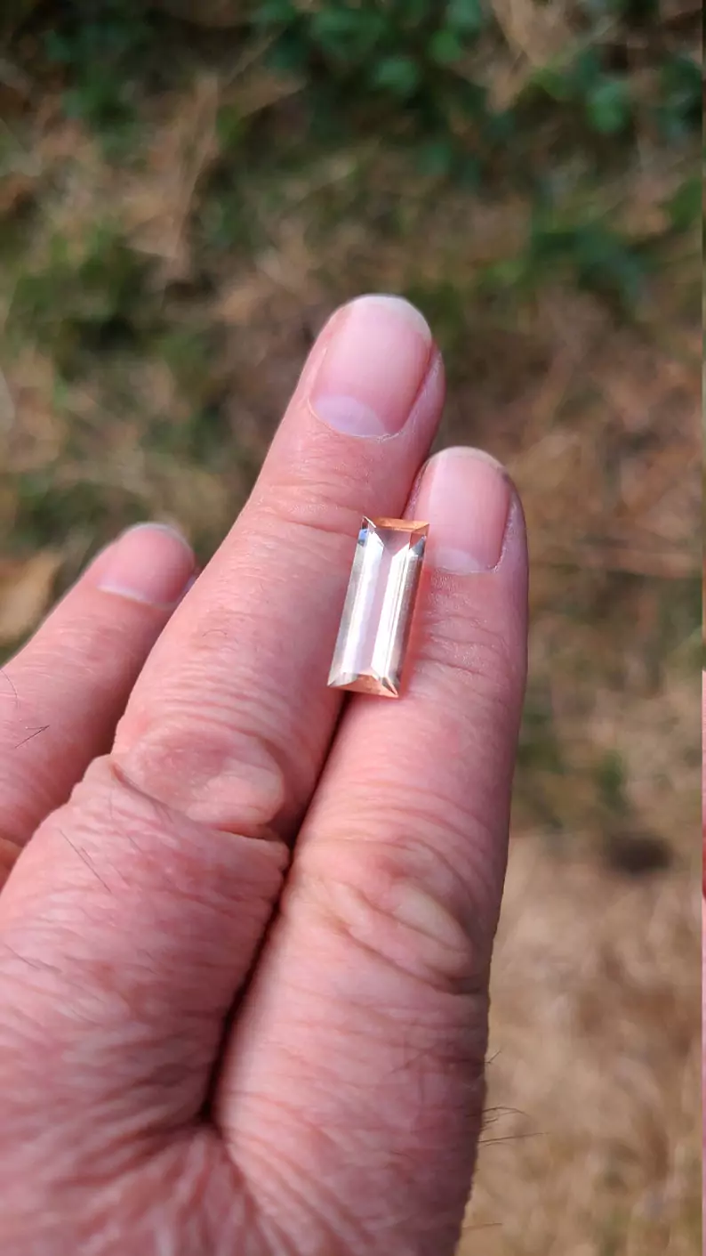 This rare 5.11ct elongated baguette Oregon Sunstone features vivid copper schiller with flashes of blue at the edges. The schiller gives it a unique banded appearance. Mined by RoseGemShop in 2019 from the Dust Devil Mine near Plush, Oregon. Measures 18.8 x 7mm—ideal for a pendant or elegant ring.
