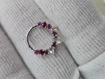 Expertly crafted with six small round, and two small pear-shaped rhodolite garnets alongside three shimmering Oregon Sunstones. This one is a dazzling piece.