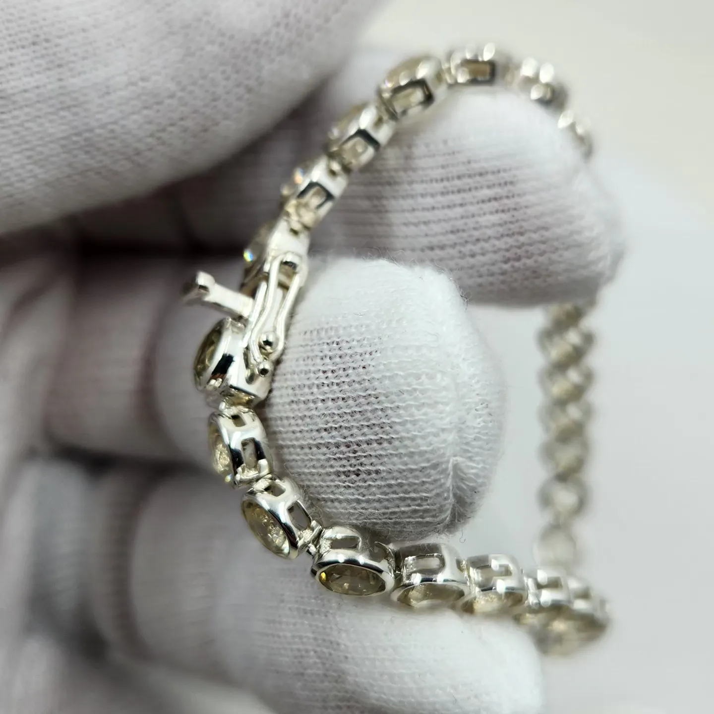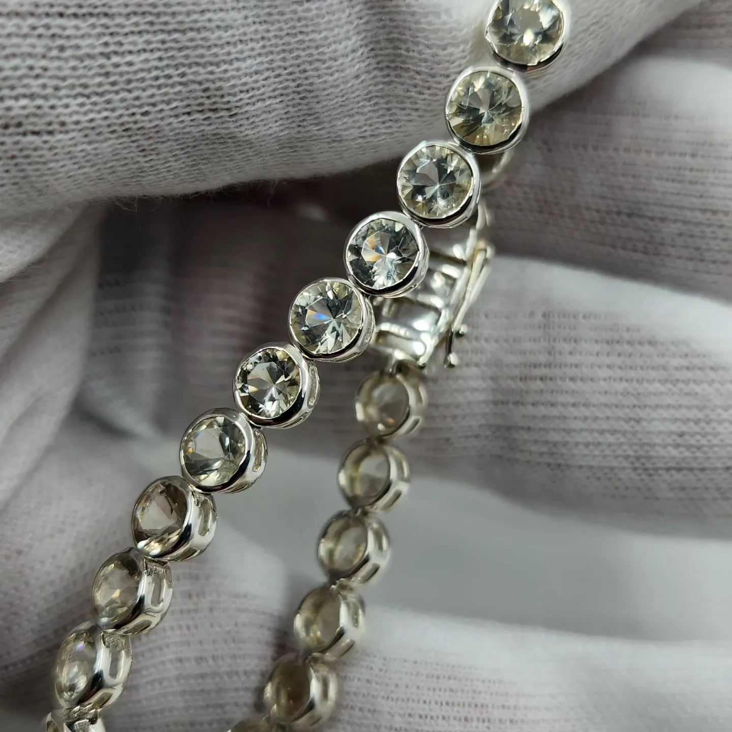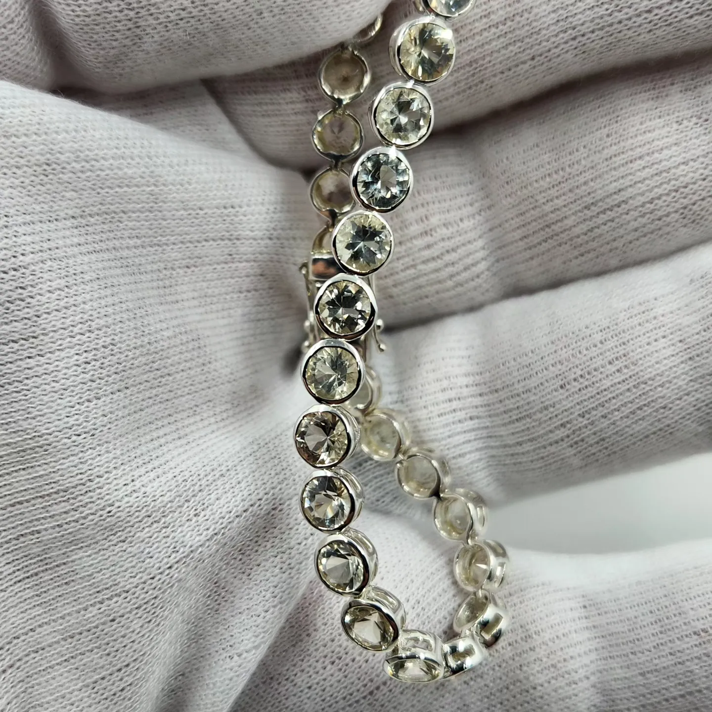 Crafted in sterling silver with a bright rhodium finish for added shine and durability, this bracelet showcases 30 genuine champagne-colored Oregon Sunstones, each measuring 5mm round. The warm, glowing tones of these natural stones complement any outfit, bringing subtle sophistication and sparkle to both casual days and glamorous nights out.
