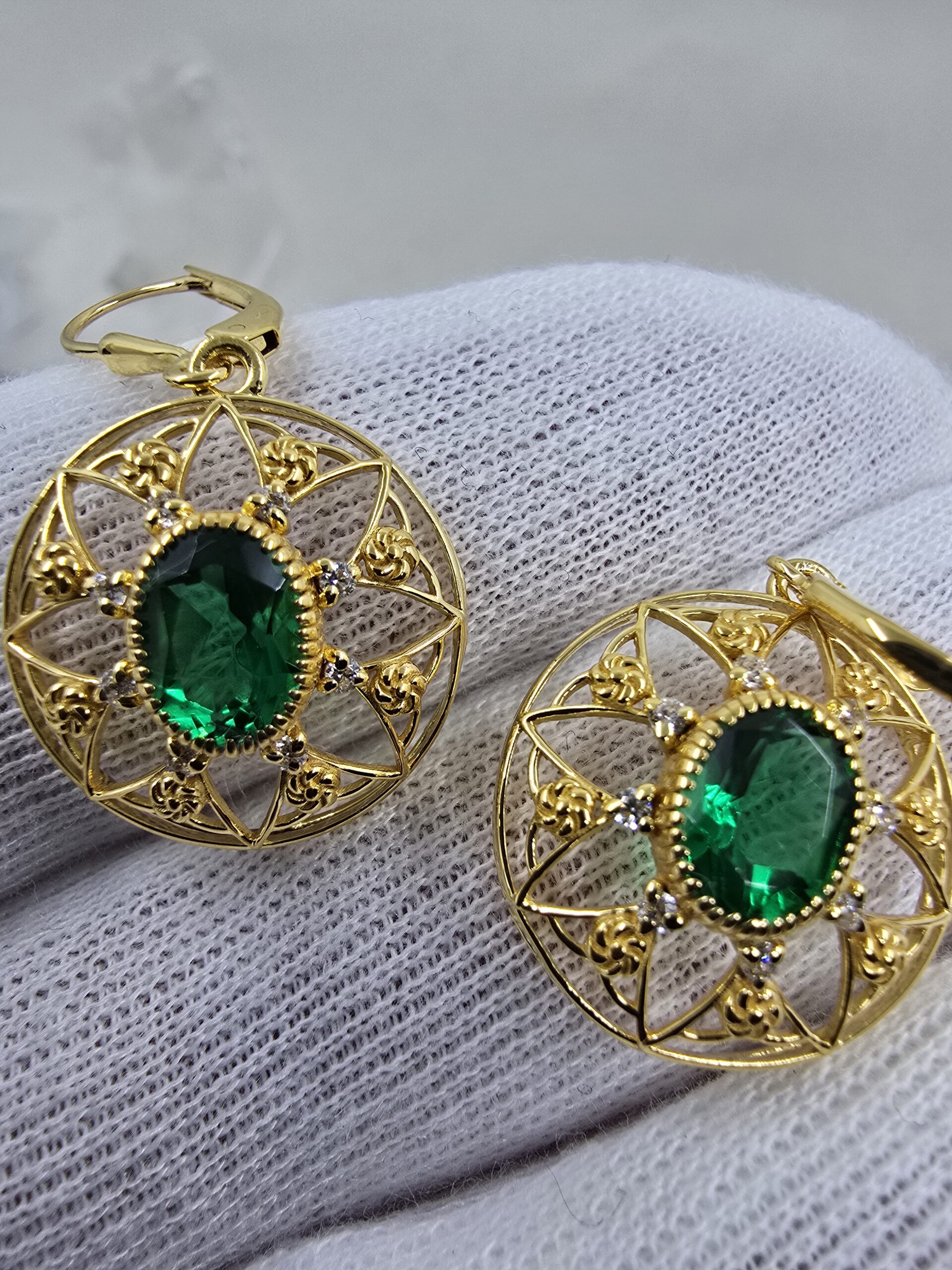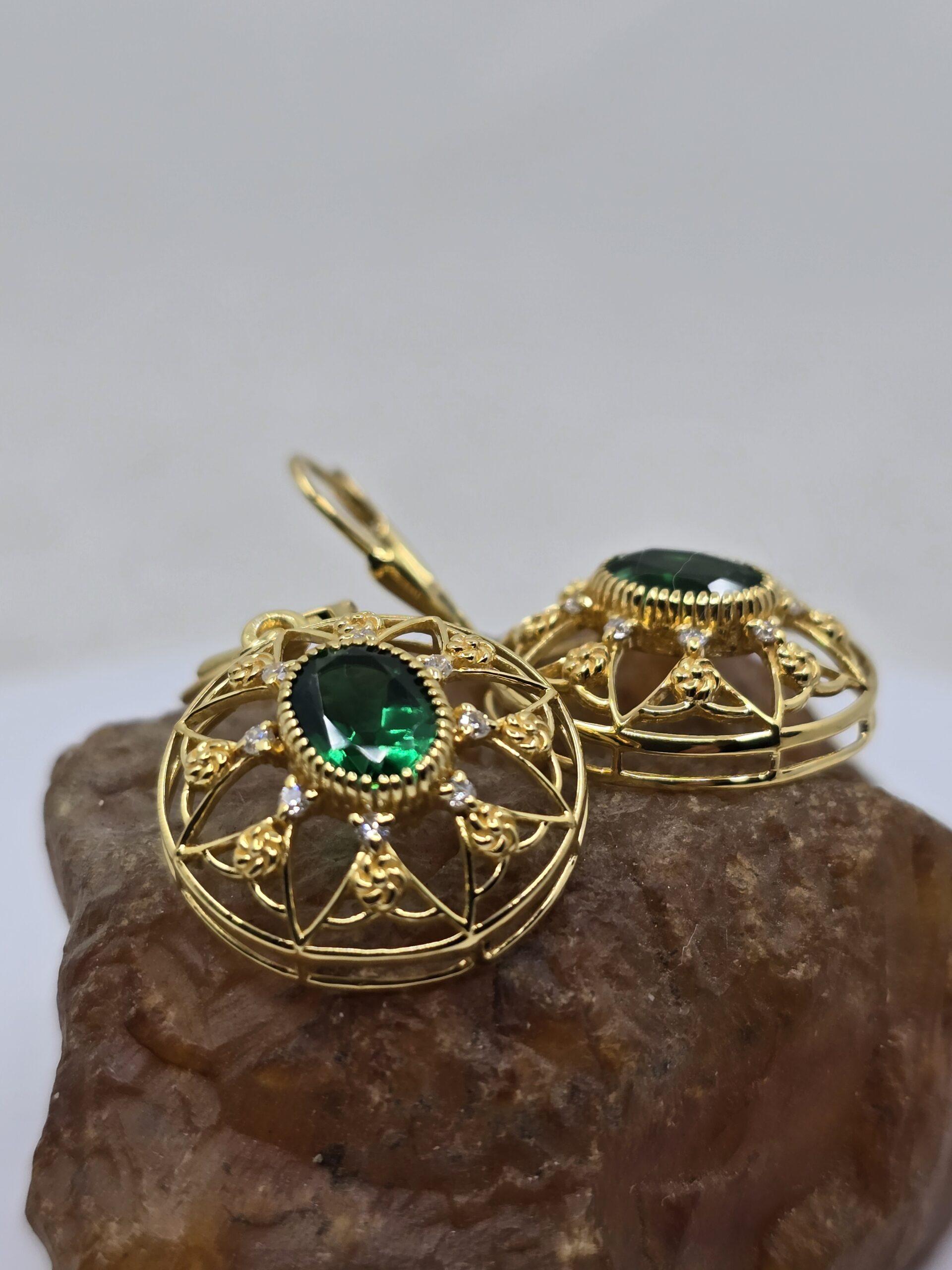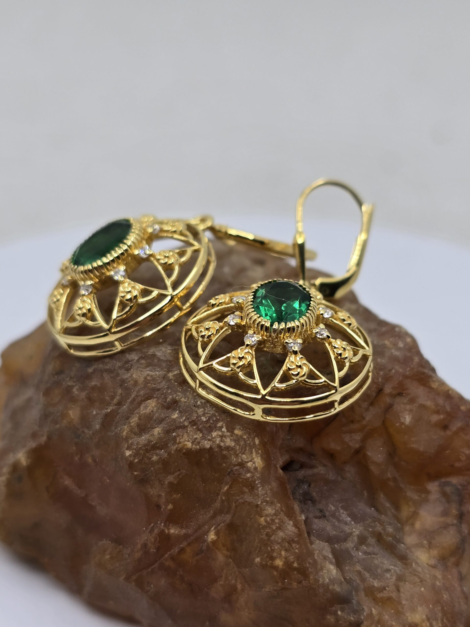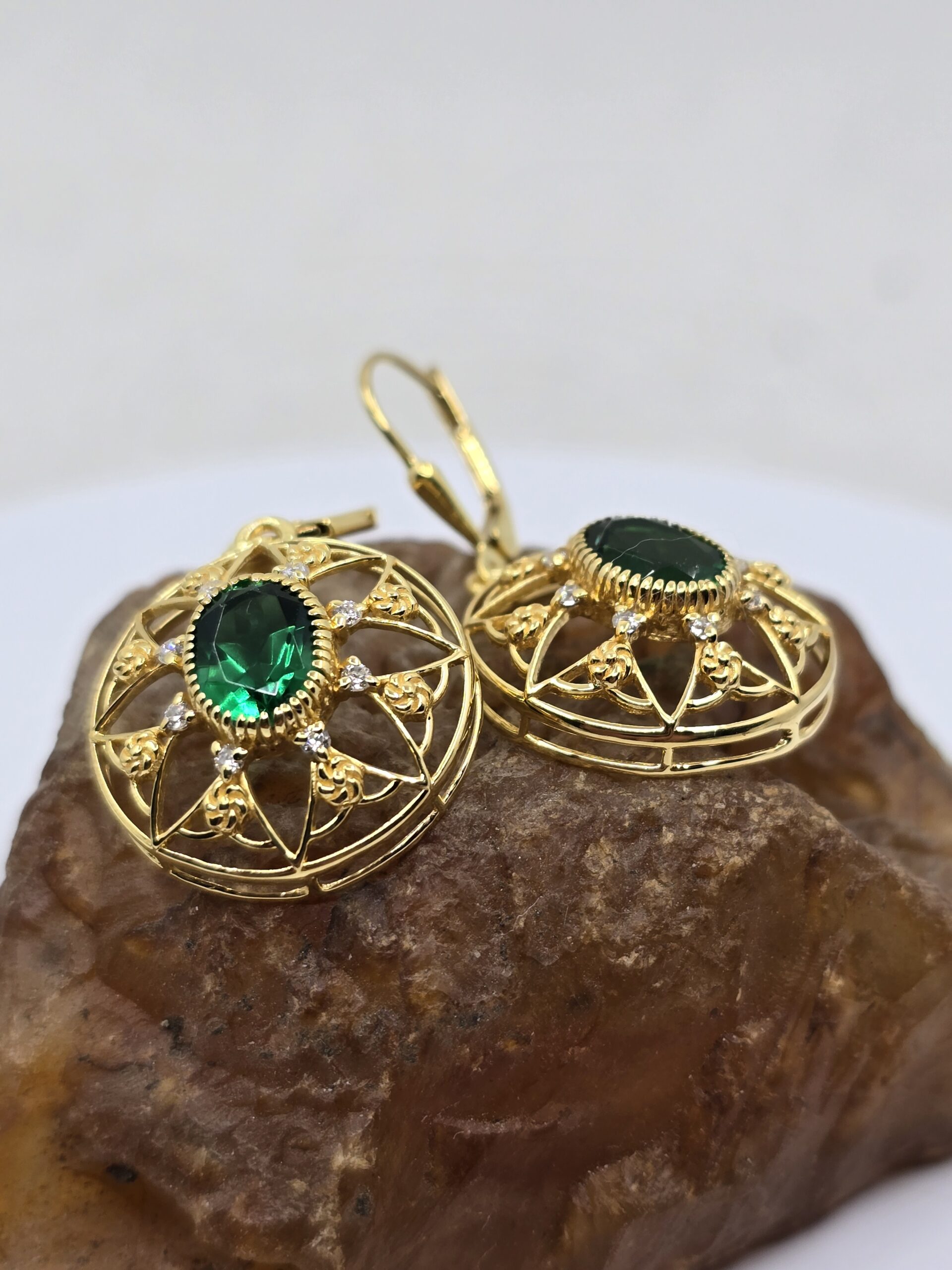 Step into timeless beauty with these **stunning lab-grown emerald earrings**! 💚 Each **1.5ct vivid green emerald** is set in an intricate **gold vermeil over sterling silver** filigree frame, adorned with sparkling **moissanite accents** for extra brilliance.