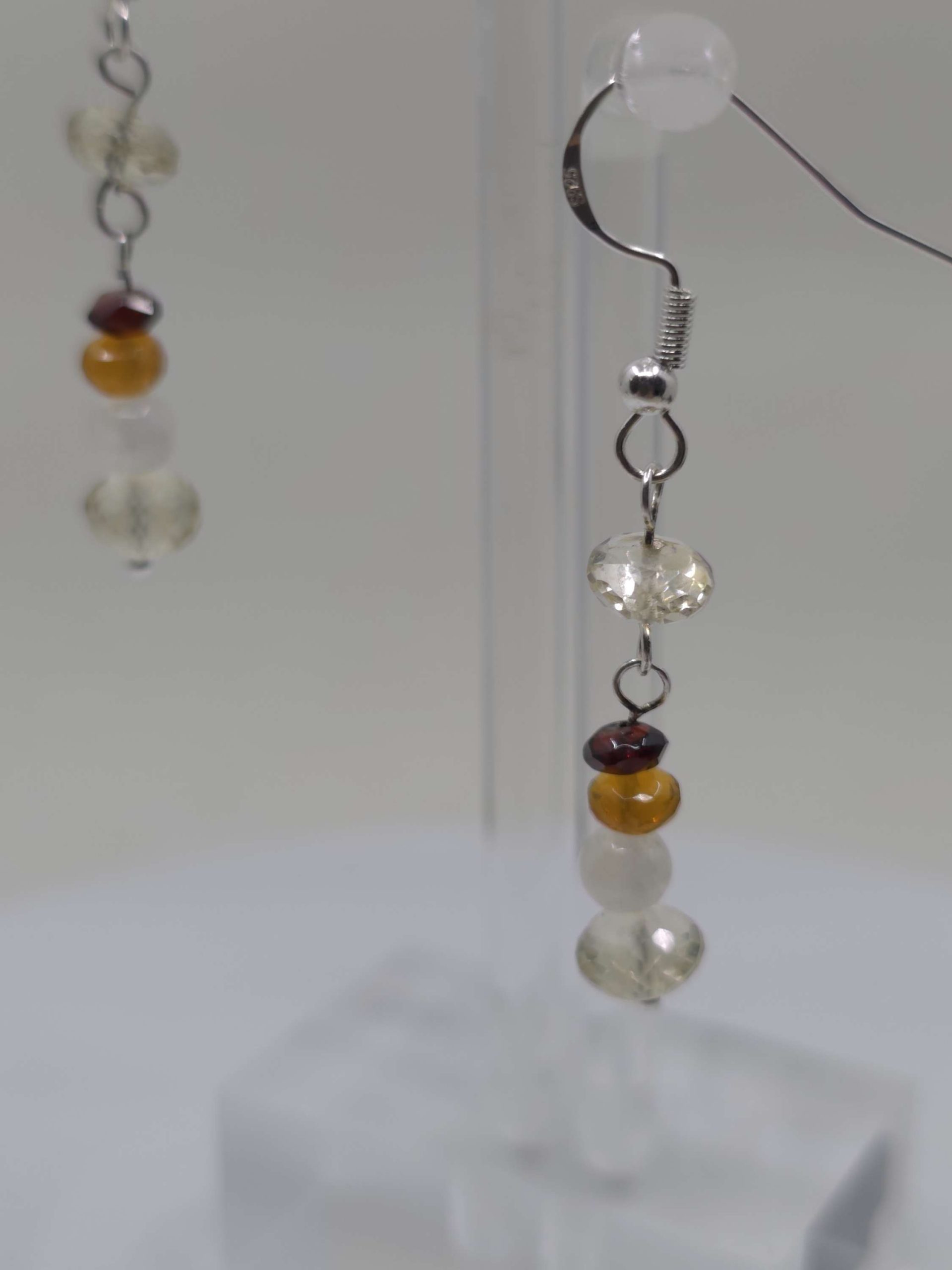 Here’s a gorgeous pair of earrings featuring shimmerimg Oregon Sunstone, moonstone, Oregon Fire Opal and garnet beads on hand made sterling silver wire settings.