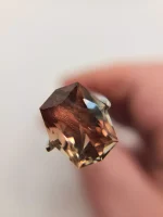 A truly one-of-a-kind 6.9ct Oregon Sunstone featuring shifting red, green, and gold hues with shimmering copper schiller. Custom octagon cut, ethically mined, and ready for a stunning custom jewelry piece.