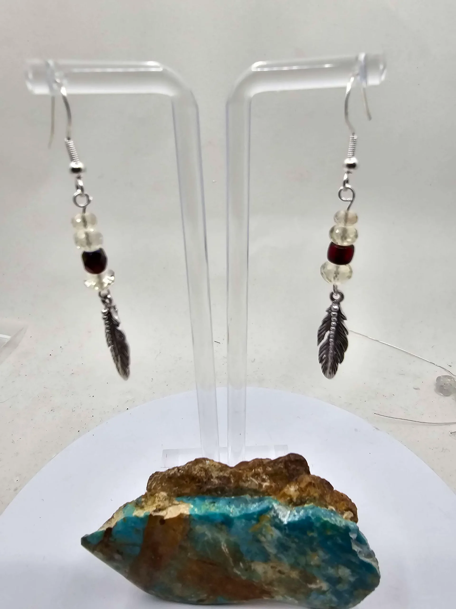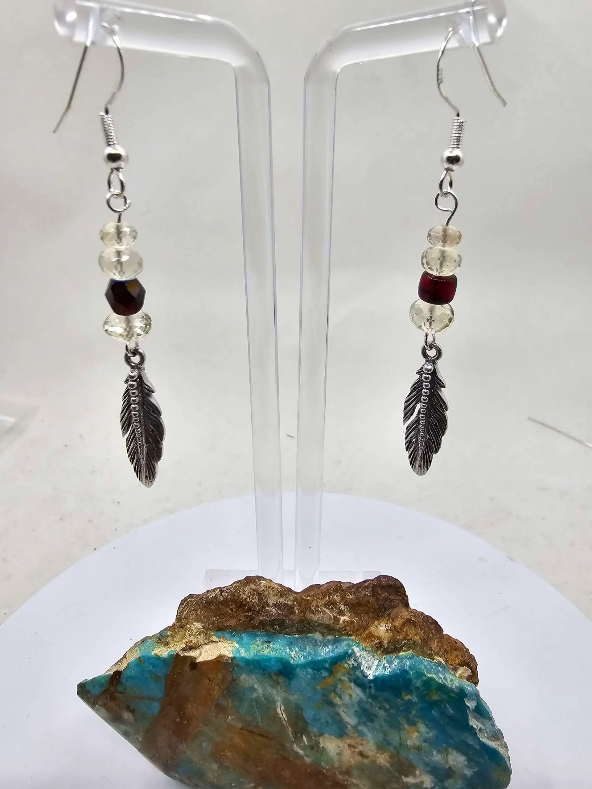 These earrings feature two beautifully faceted champagne Oregon Sunstone beads and a red Swarovski glass bead on each. Finished with a 1″ long sterling silver feather and all sterling silver wire.