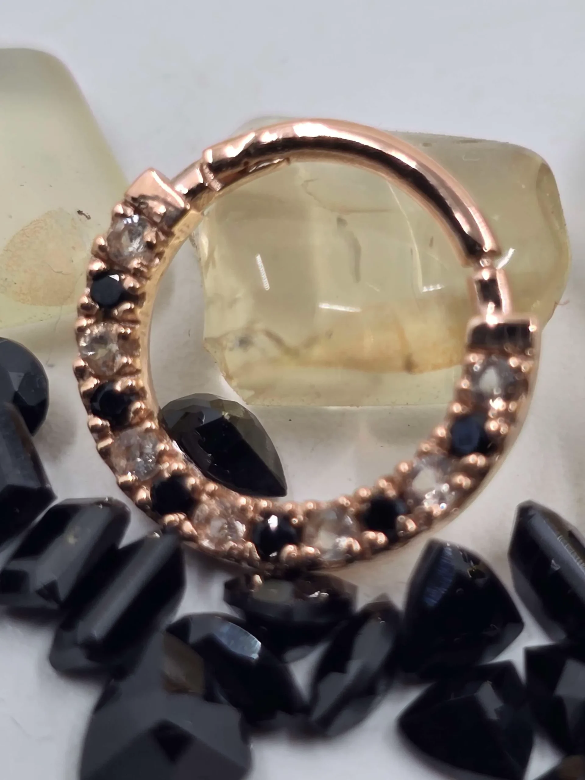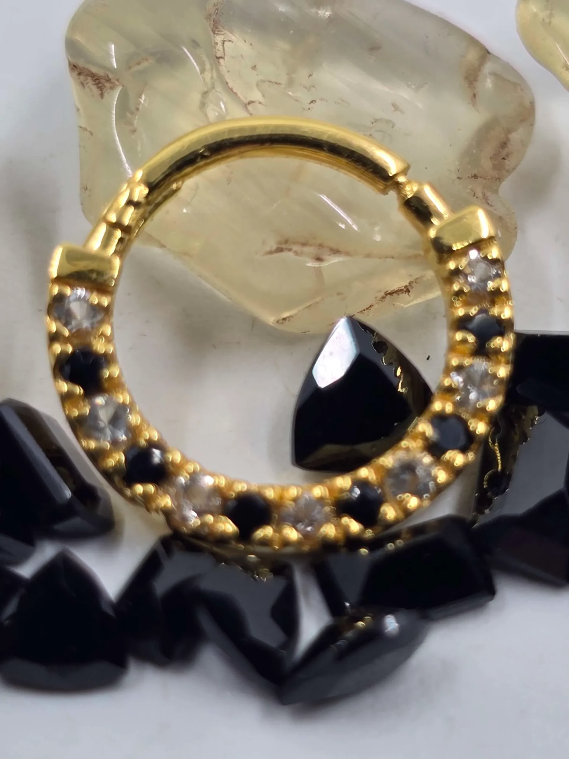 Set with alternating black spinel and ethically mined Oregon Sunstone, Parvati celebrates the duality of shadow and light. The deep mystery of black spinel contrasts perfectly with the warm shimmer of Oregon Sunstone, creating a hypnotic rhythm of gemstones that catch the light and demand attention. Whether you’re dressing up or going minimal, this clicker adds edge and elegance to any look.