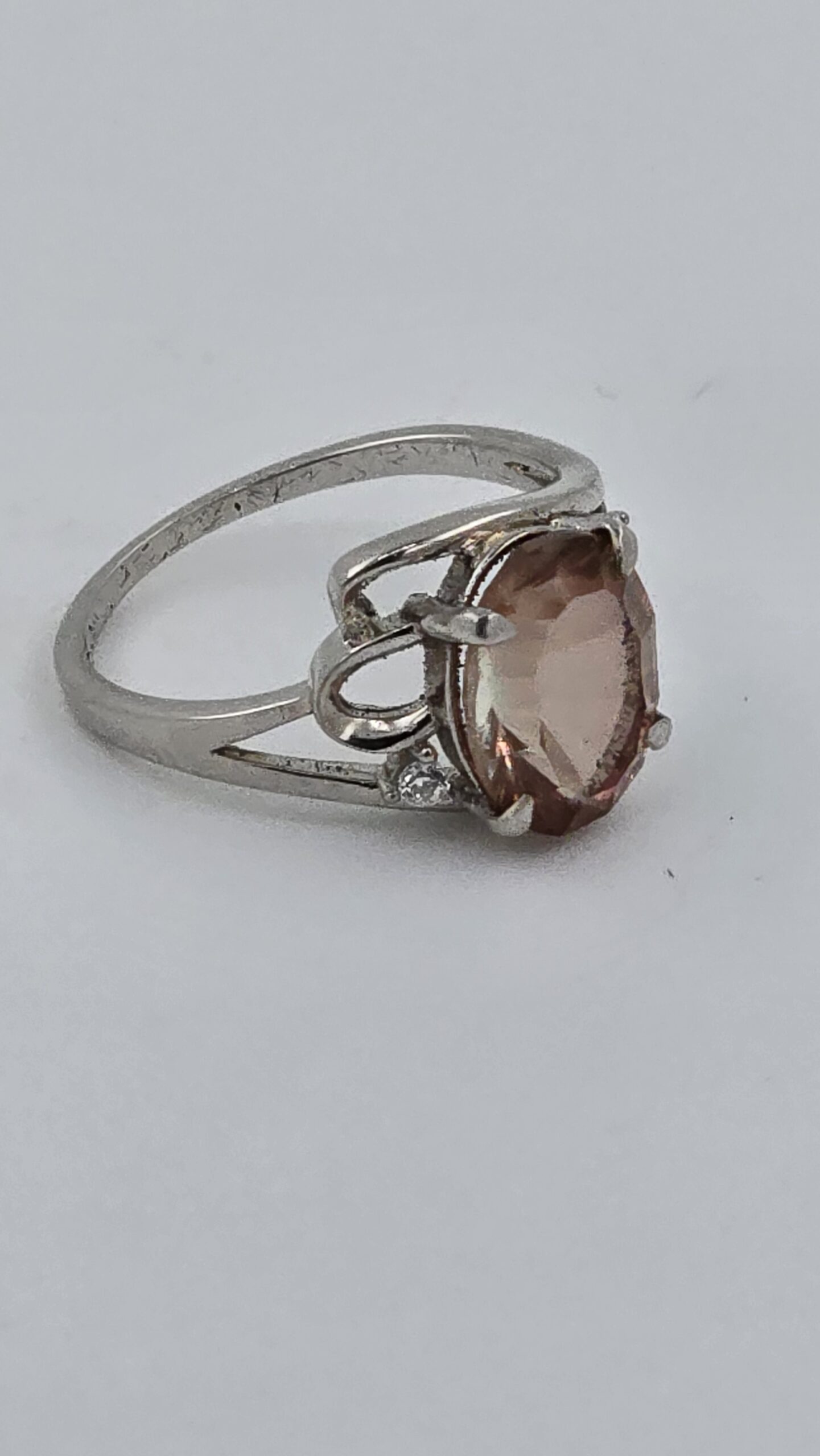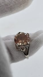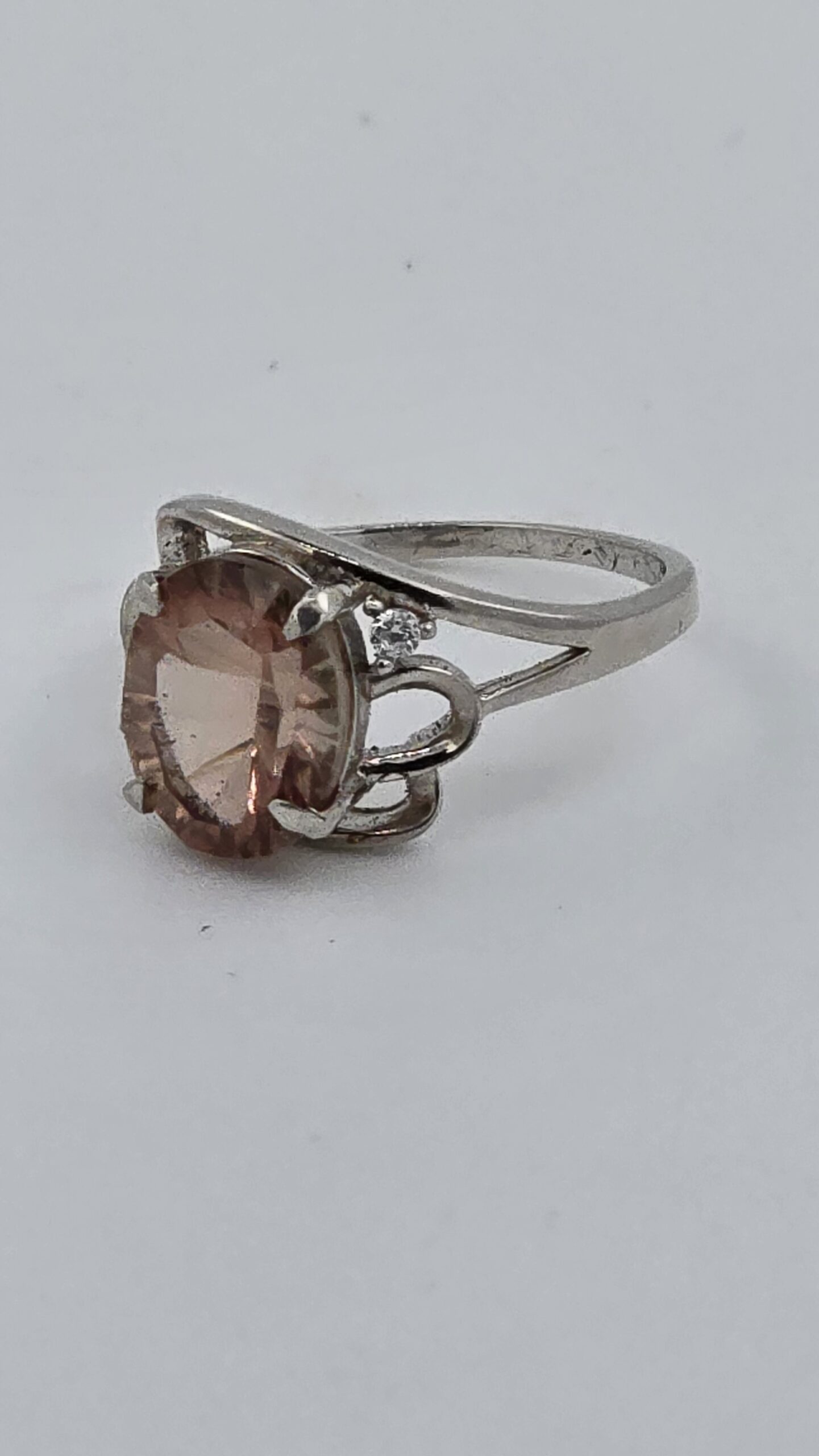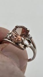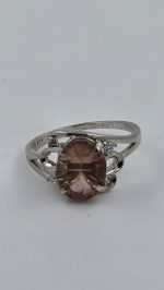 A dreamy, light-catching 2.25ct concave-cut pink Oregon Sunstone takes center stage in this elegant sterling silver (925) size 6 ring, finished with two sparkling CZ accent stones for extra shimmer.