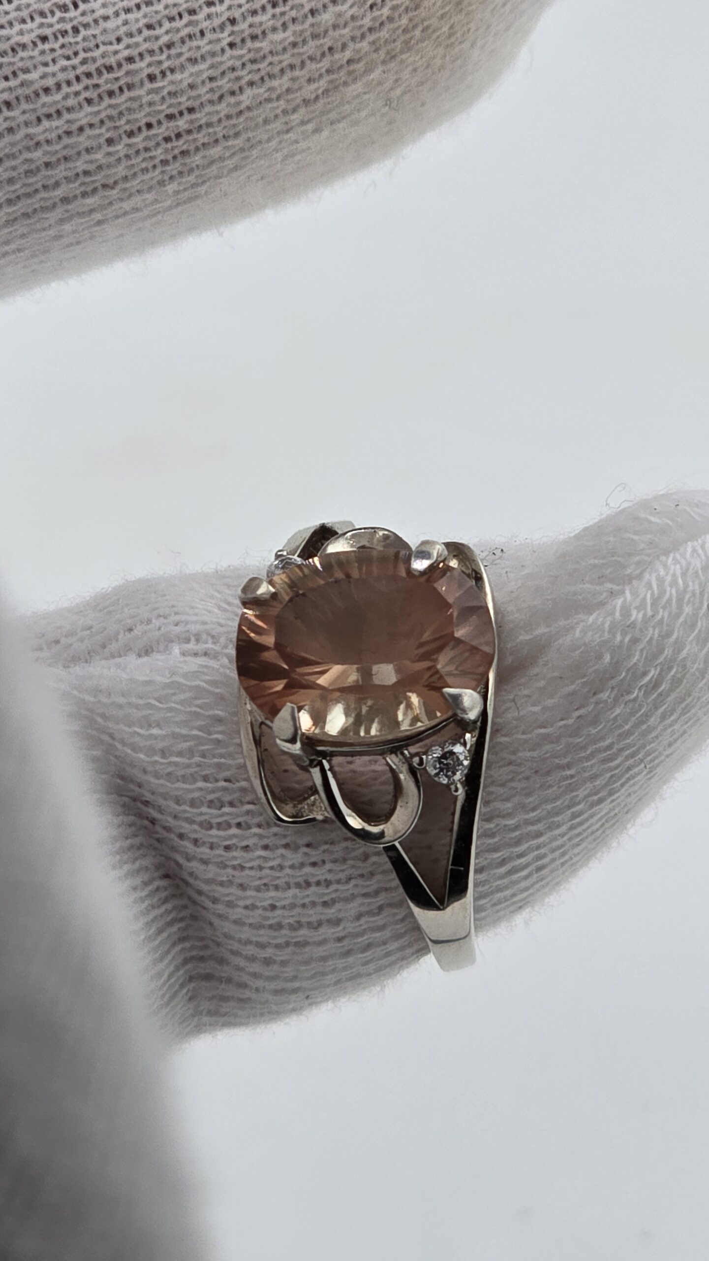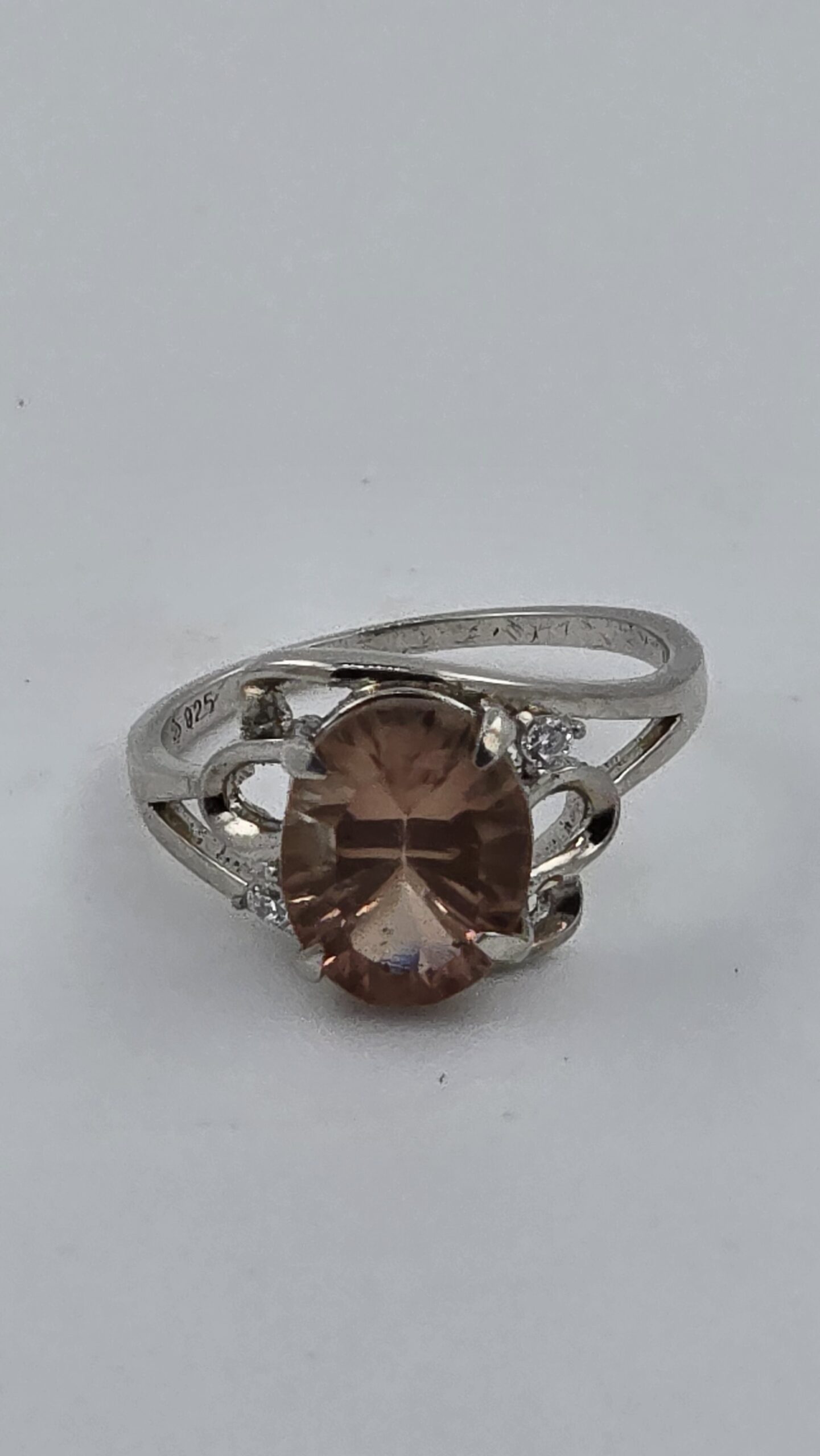 Meet your new everyday showpiece: a genuine Oregon Sunstone with a mesmerizing concave cut that throws light in crisp flashes and soft, champagne-pink glow. The center stone is set in polished sterling silver with a graceful, airy gallery and two CZ accent stones that add just the right amount of sparkle without stealing the spotlight.